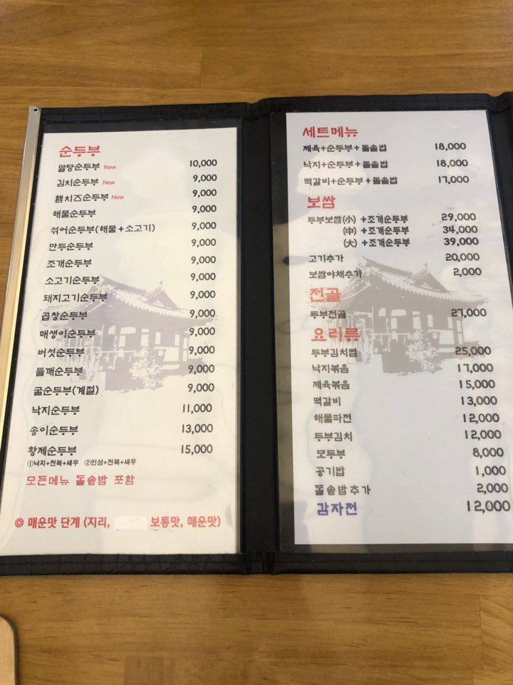 메뉴는 거의 모든 순두부가 9000원이고 특별한 순두부는 더 비쌌다..