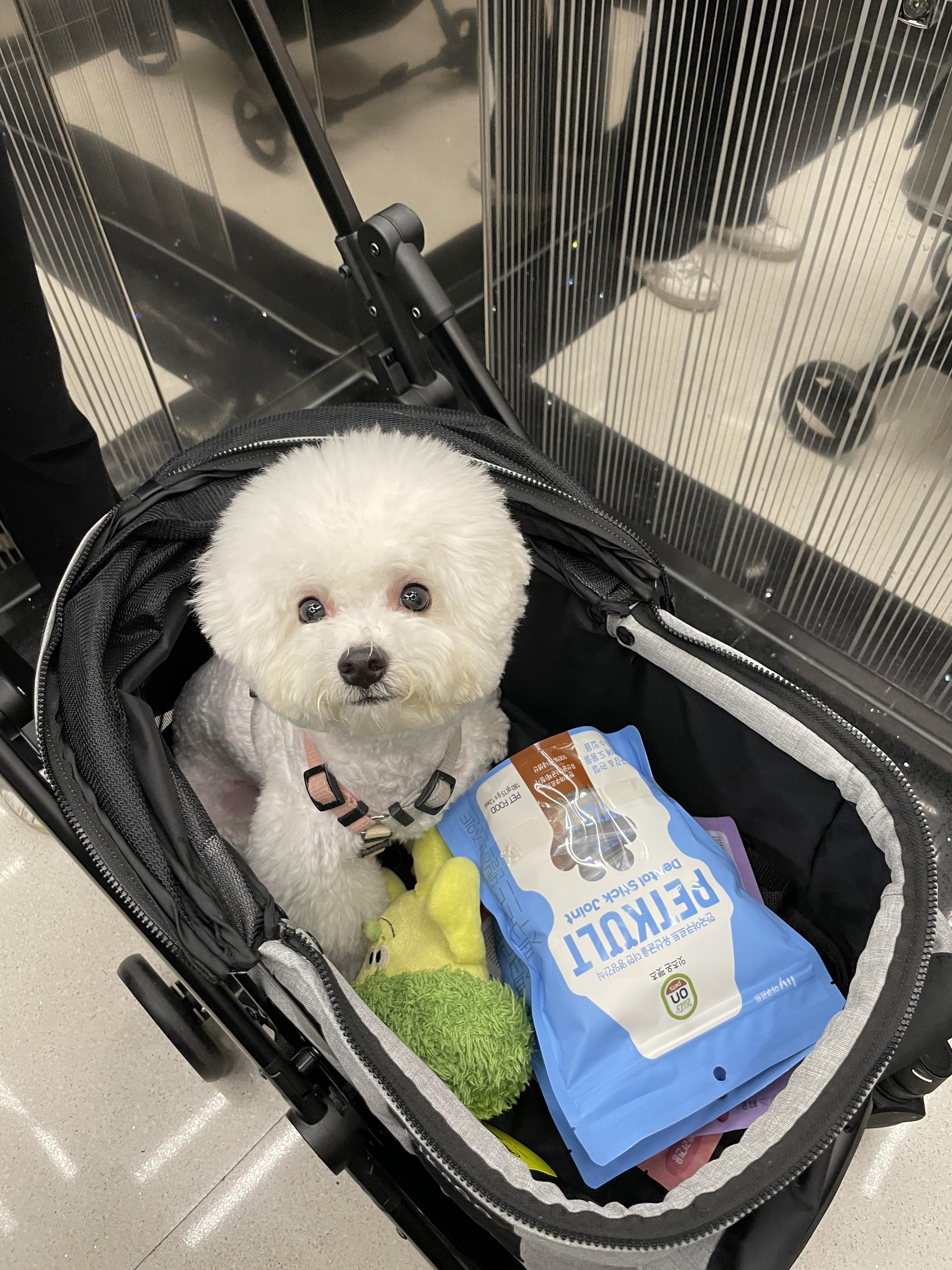 우리 배니는 3.8키로의 미니 비숑인데 공간이 아주 넉넉해서 인형같은걸 함께 넣어주는 편이고 가끔 쇼핑한것이 많을땐 짐도 같이 넣는다!